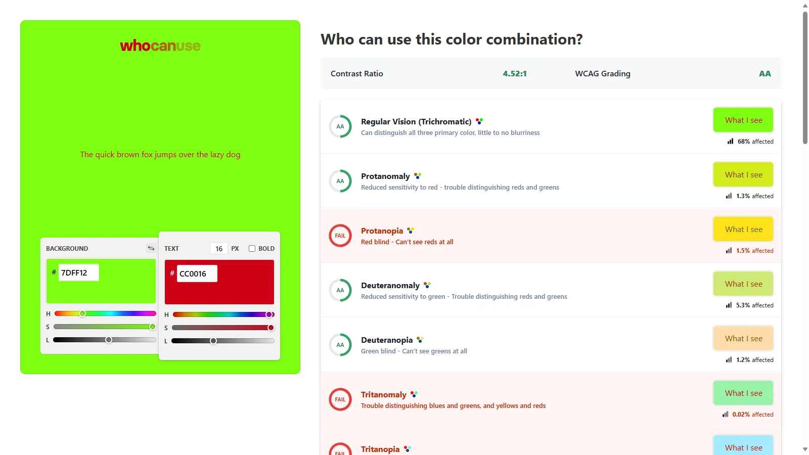 For example, red and green may technically pass AA standard with a ratio of 4.5:1